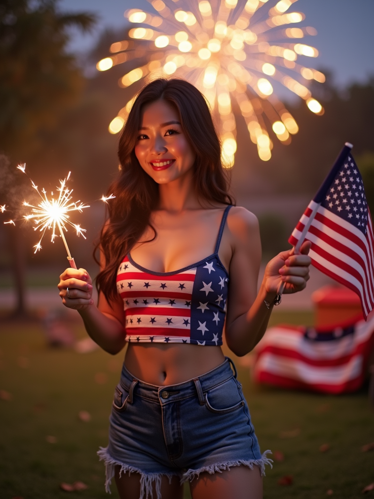 model at a 4th of July backyard barbecue, wearing a stars and stripes crop top and high-waisted blue shorts , holding sparklers and a small American flag, surrounded by patriotic decorations, fireworks bursting in the sky