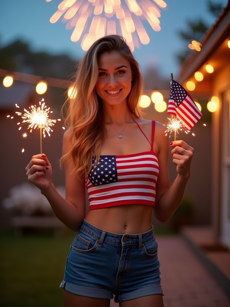 model at a 4th of July backyard barbecue, wearing a stars and stripes crop top and high-waisted blue shorts , holding sparklers and a small American flag, surrounded by patriotic decorations, fireworks bursting in the sky