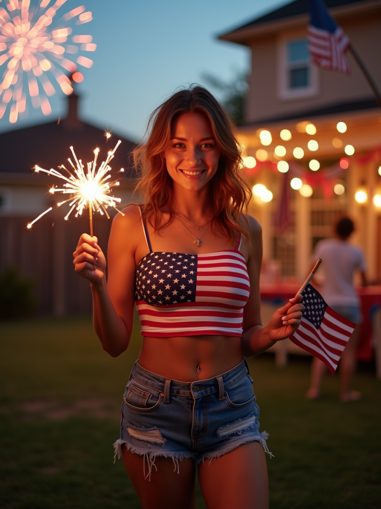 model at a 4th of July backyard barbecue, wearing a stars and stripes crop top and high-waisted blue shorts , holding sparklers and a small American flag, surrounded by patriotic decorations, fireworks bursting in the sky