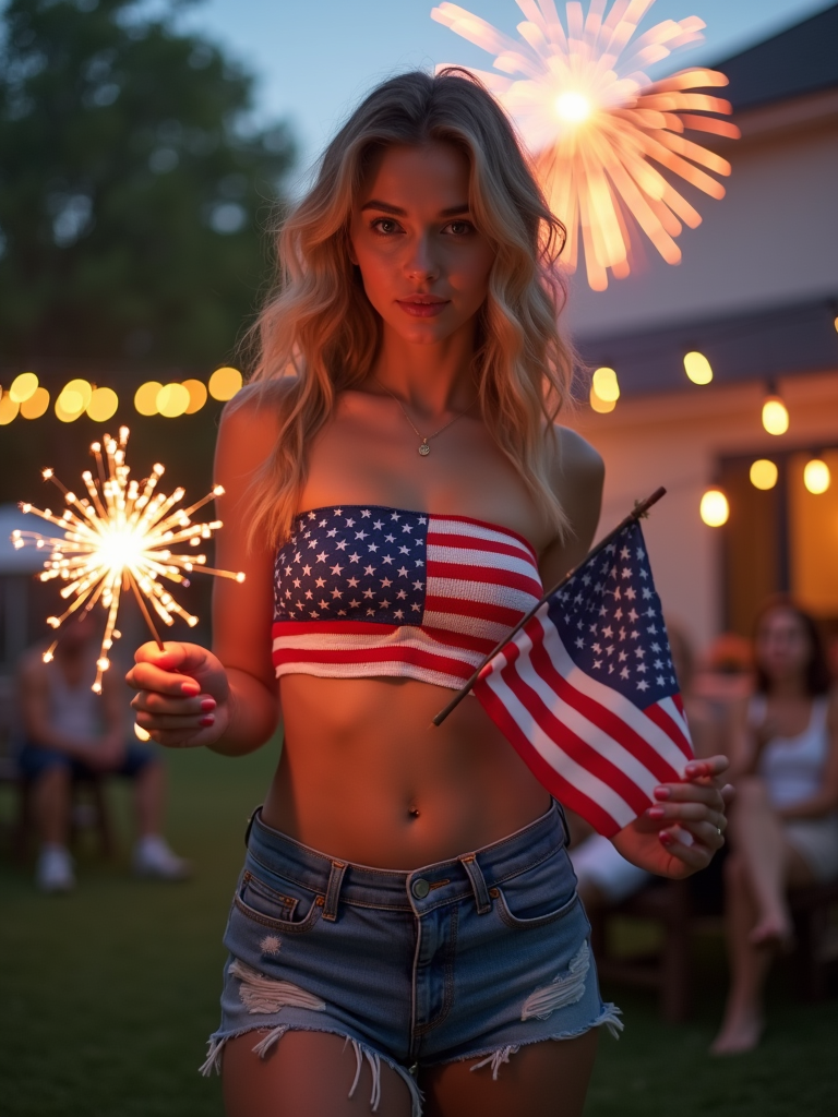 model at a 4th of July backyard barbecue, wearing a stars and stripes crop top and high-waisted blue shorts , holding sparklers and a small American flag, surrounded by patriotic decorations, fireworks bursting in the sky