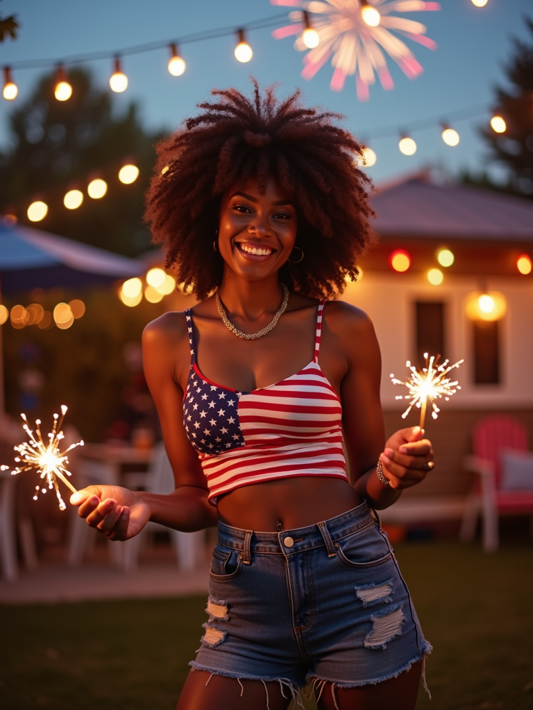 model at a 4th of July backyard barbecue, wearing a stars and stripes crop top and high-waisted blue shorts , holding sparklers and a small American flag, surrounded by patriotic decorations, fireworks bursting in the sky