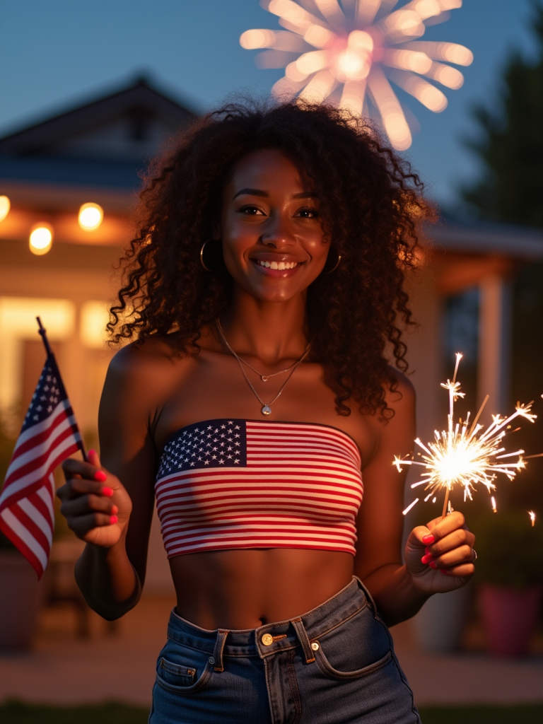 model at a 4th of July backyard barbecue, wearing a stars and stripes crop top and high-waisted blue shorts , holding sparklers and a small American flag, surrounded by patriotic decorations, fireworks bursting in the sky