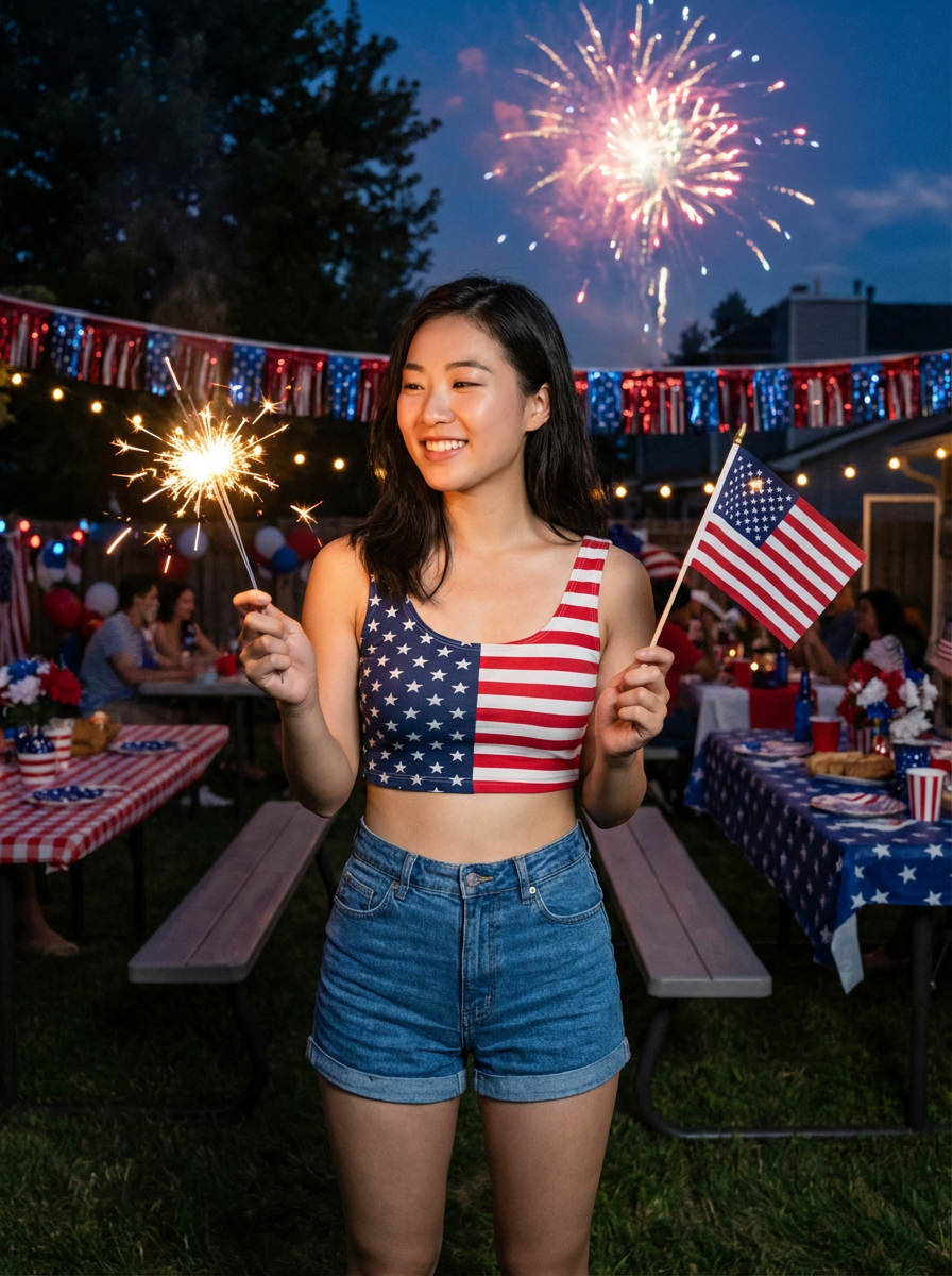 model at a 4th of July backyard barbecue, wearing a stars and stripes crop top and high-waisted blue shorts , holding sparklers and a small American flag, surrounded by patriotic decorations, fireworks bursting in the sky