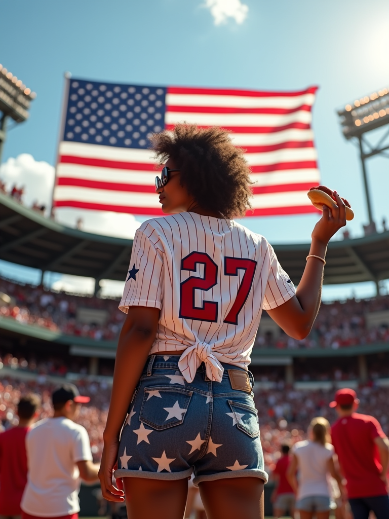 model at a baseball game in a historic stadium, wearing a team jersey tied at the waist, American flag denim shorts , holding a hot dog and waving a small flag, surrounded by excited fans in patriotic colors, giant American flag being unfurled across the field