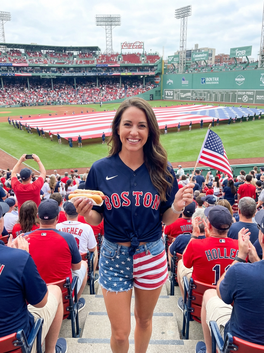 model at a baseball game in a historic stadium, wearing a team jersey tied at the waist, American flag denim shorts , holding a hot dog and waving a small flag, surrounded by excited fans in patriotic colors, giant American flag being unfurled across the field