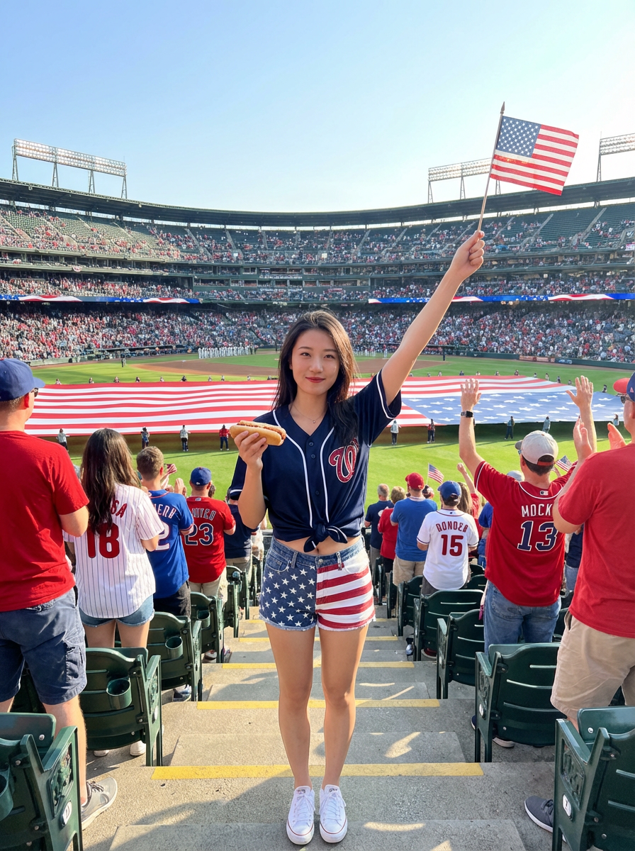 model at a baseball game in a historic stadium, wearing a team jersey tied at the waist, American flag denim shorts , holding a hot dog and waving a small flag, surrounded by excited fans in patriotic colors, giant American flag being unfurled across the field