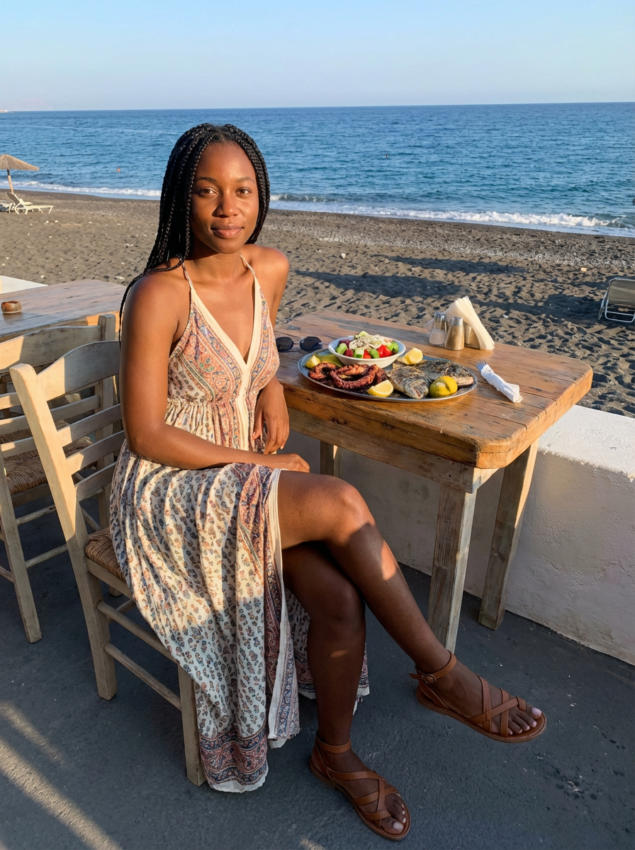 model at a beachside taverna in Kamari, wearing a light beach dress with sandals , fresh Greek seafood and ocean views