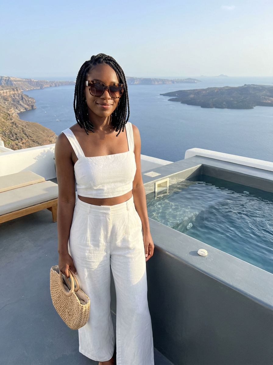 model at a boutique hotel terrace, wearing a chic resort outfit with designer sunglasses , private jacuzzi and caldera panorama