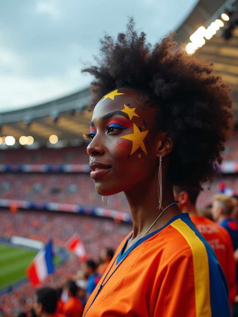 model at a Champions League football match in a historic stadium, wearing team colors with European star face paint , surrounded by excited fans waving flags of different European nations, stadium decorated with European unity banners