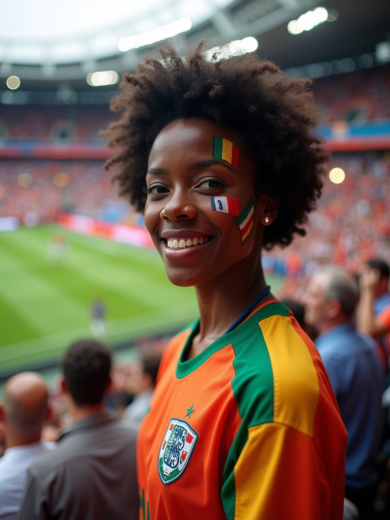 model at a Champions League football match in a historic stadium, wearing team colors with European star face paint , surrounded by excited fans waving flags of different European nations, stadium decorated with European unity banners