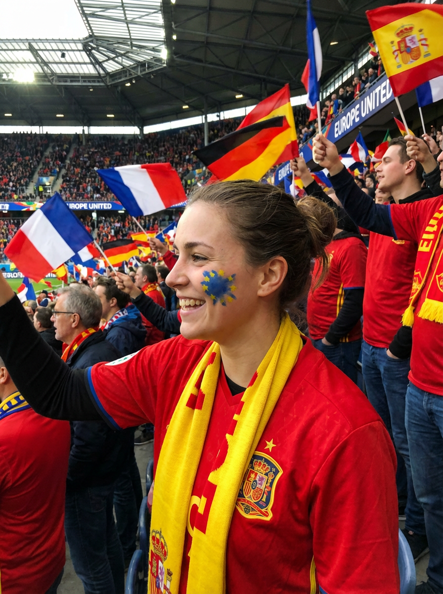 model at a Champions League football match in a historic stadium, wearing team colors with European star face paint , surrounded by excited fans waving flags of different European nations, stadium decorated with European unity banners