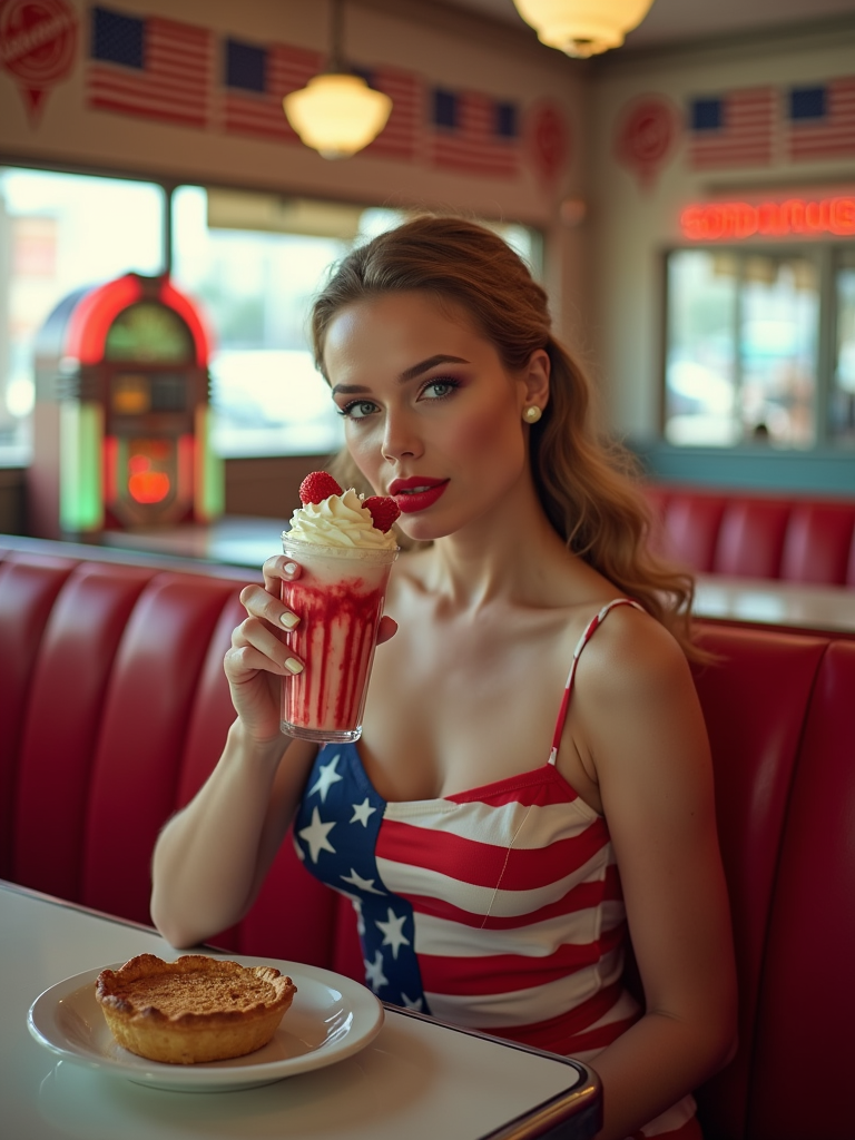 model at a classic American diner, seated at a retro booth with red vinyl seats, wearing a 1950s-inspired stars and stripes dress , enjoying a milkshake and apple pie, walls decorated with American flags, vintage jukebox playing "God Bless America" in the background