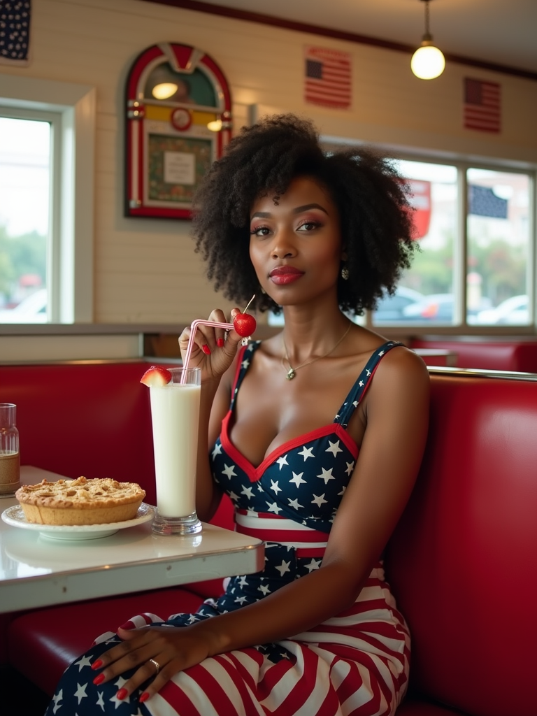 model at a classic American diner, seated at a retro booth with red vinyl seats, wearing a 1950s-inspired stars and stripes dress , enjoying a milkshake and apple pie, walls decorated with American flags, vintage jukebox playing "God Bless America" in the background