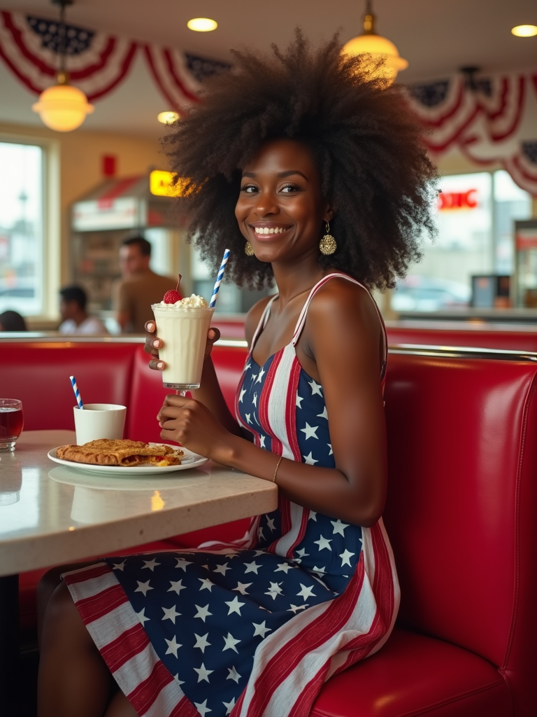 model at a classic American diner, seated at a retro booth with red vinyl seats, wearing a 1950s-inspired stars and stripes dress , enjoying a milkshake and apple pie, walls decorated with American flags, vintage jukebox playing "God Bless America" in the background