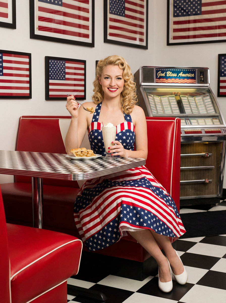 model at a classic American diner, seated at a retro booth with red vinyl seats, wearing a 1950s-inspired stars and stripes dress , enjoying a milkshake and apple pie, walls decorated with American flags, vintage jukebox playing "God Bless America" in the background