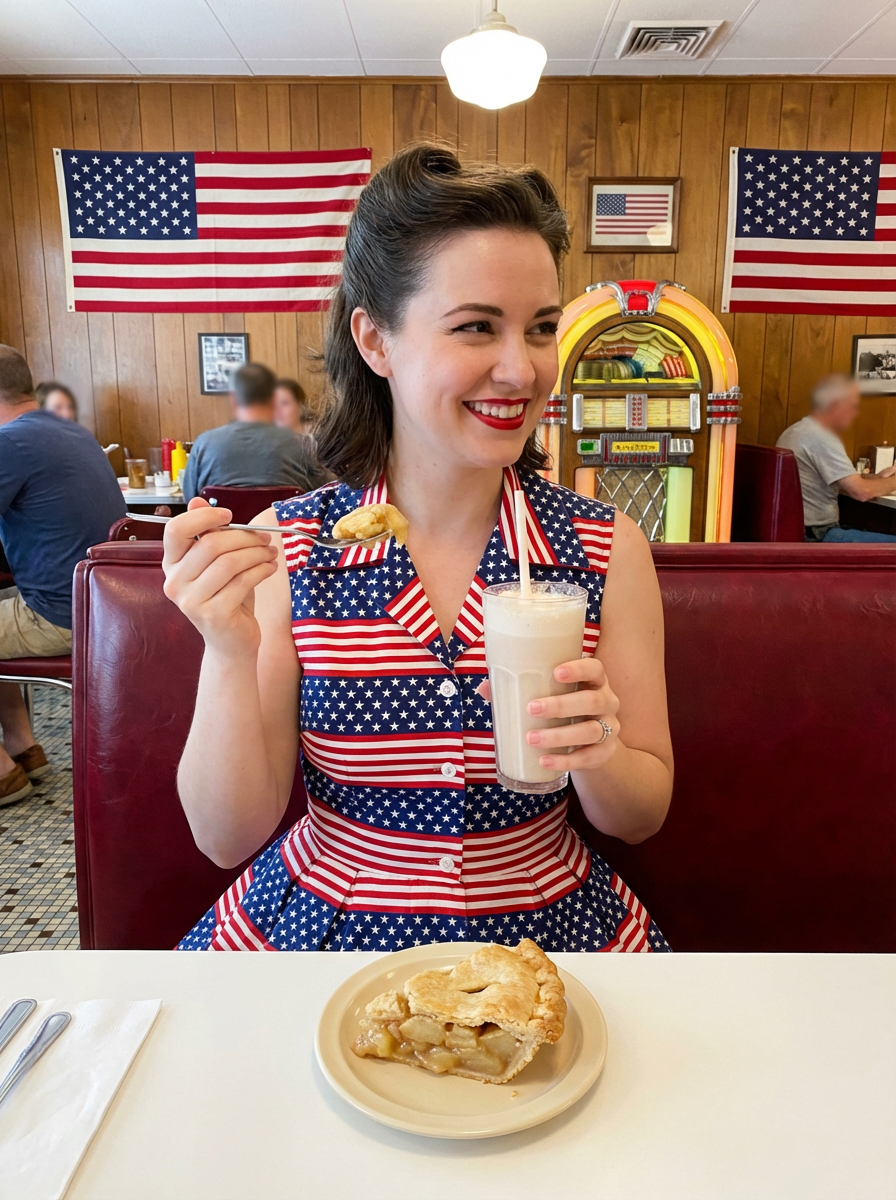 model at a classic American diner, seated at a retro booth with red vinyl seats, wearing a 1950s-inspired stars and stripes dress , enjoying a milkshake and apple pie, walls decorated with American flags, vintage jukebox playing "God Bless America" in the background