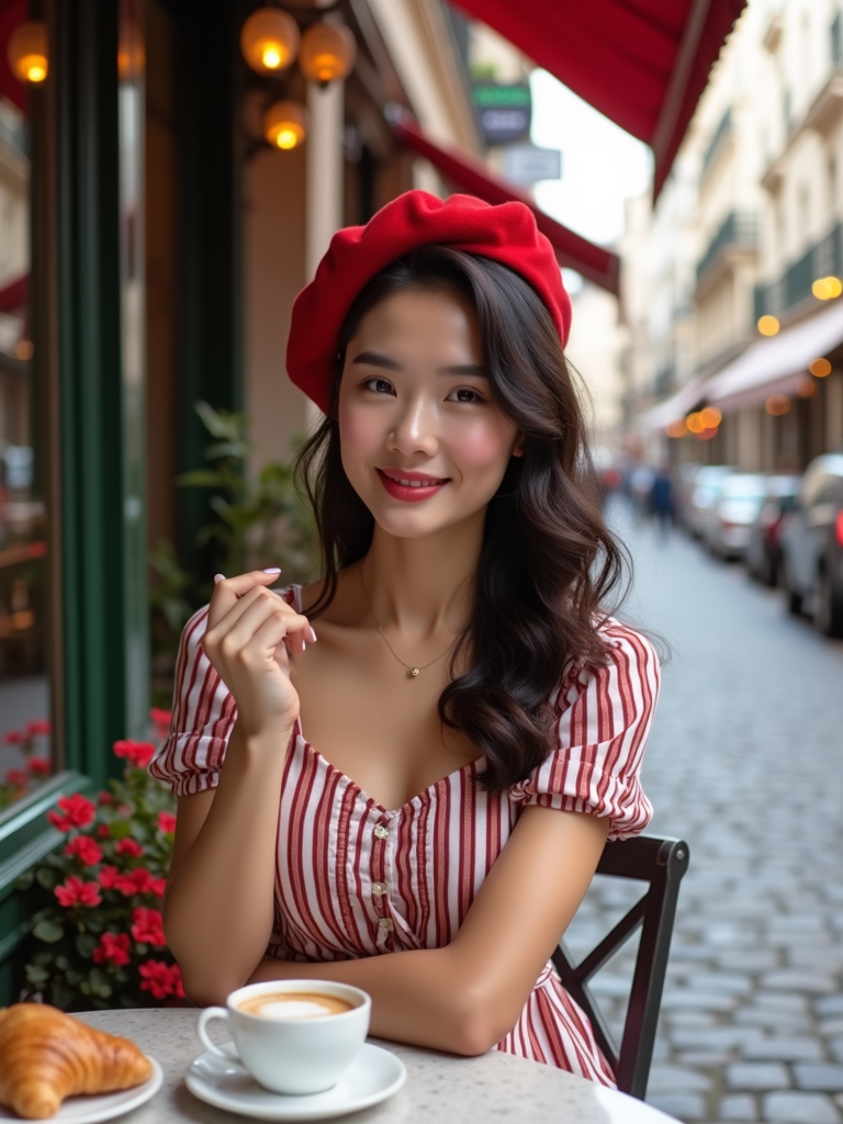 model at a classic Parisian café, seated at a charming outdoor table, wearing a chic striped dress with red beret , enjoying espresso and croissants, cobblestone streets and flower boxes creating an authentic European ambiance