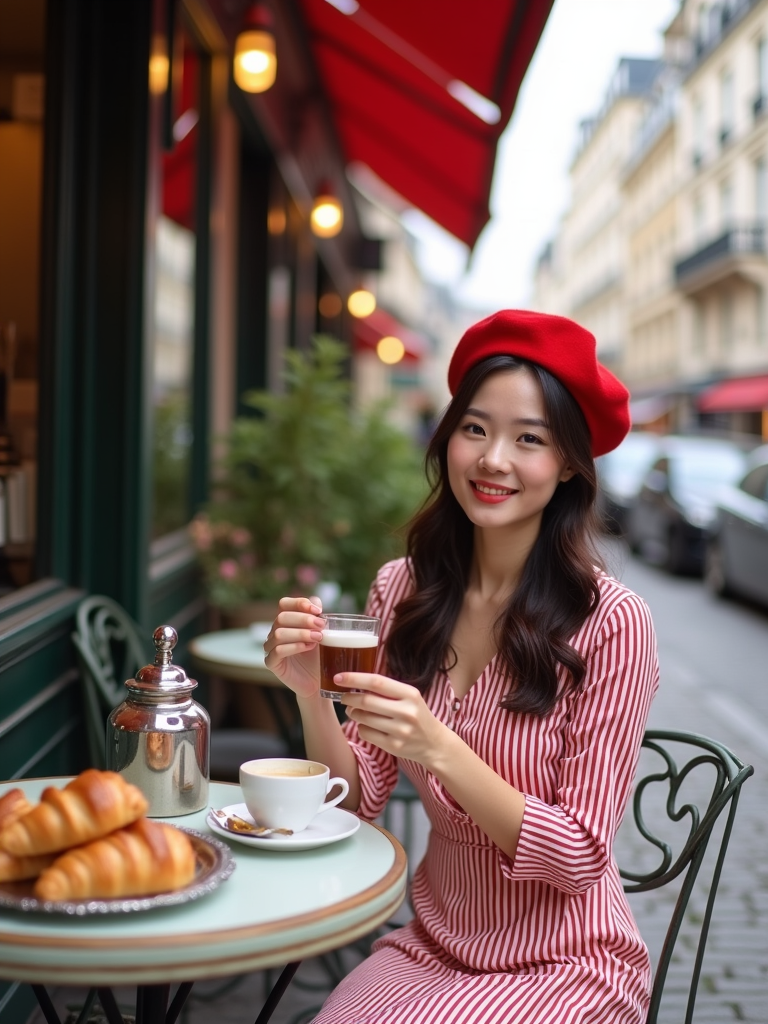 model at a classic Parisian café, seated at a charming outdoor table, wearing a chic striped dress with red beret , enjoying espresso and croissants, cobblestone streets and flower boxes creating an authentic European ambiance