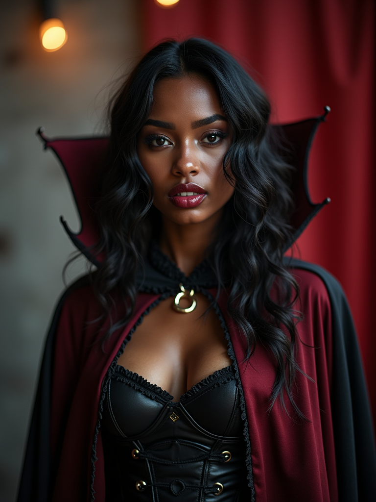 model at a cosplay photo booth, wearing a vampire queen outfit with a corset and flowing cape , soft focus background, emphasizing character detail