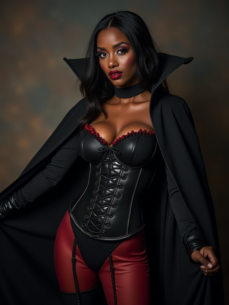 model at a cosplay photo booth, wearing a vampire queen outfit with a corset and flowing cape , soft focus background, emphasizing character detail
