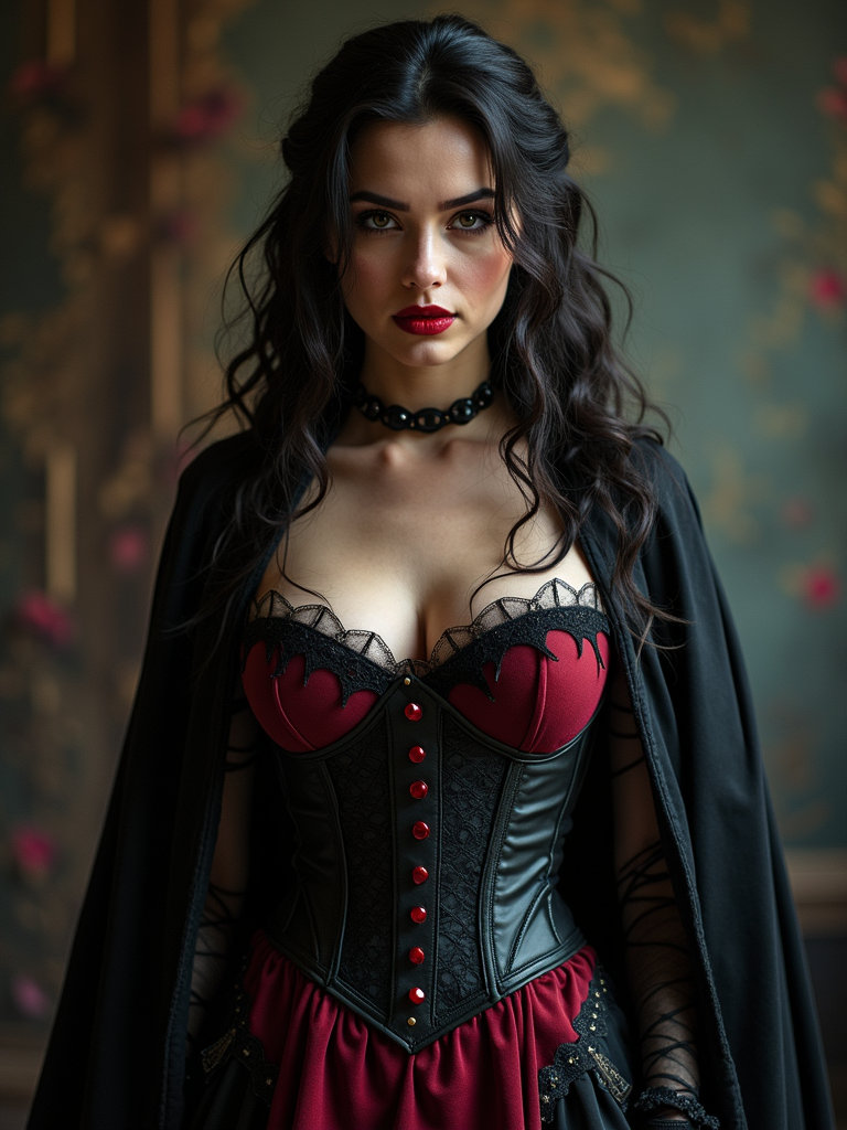 model at a cosplay photo booth, wearing a vampire queen outfit with a corset and flowing cape , soft focus background, emphasizing character detail