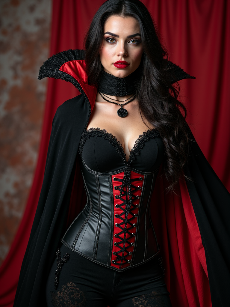 model at a cosplay photo booth, wearing a vampire queen outfit with a corset and flowing cape , soft focus background, emphasizing character detail