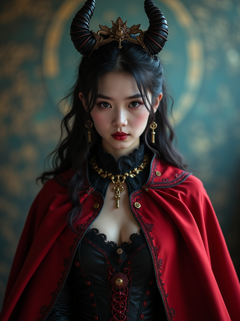 model at a cosplay photo booth, wearing a vampire queen outfit with a corset and flowing cape , soft focus background, emphasizing character detail