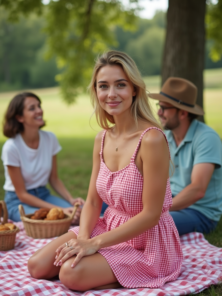 model at a countryside picnic with family, wearing a gingham dress, sitting on a picnic blanket with home-baked goods, family members around