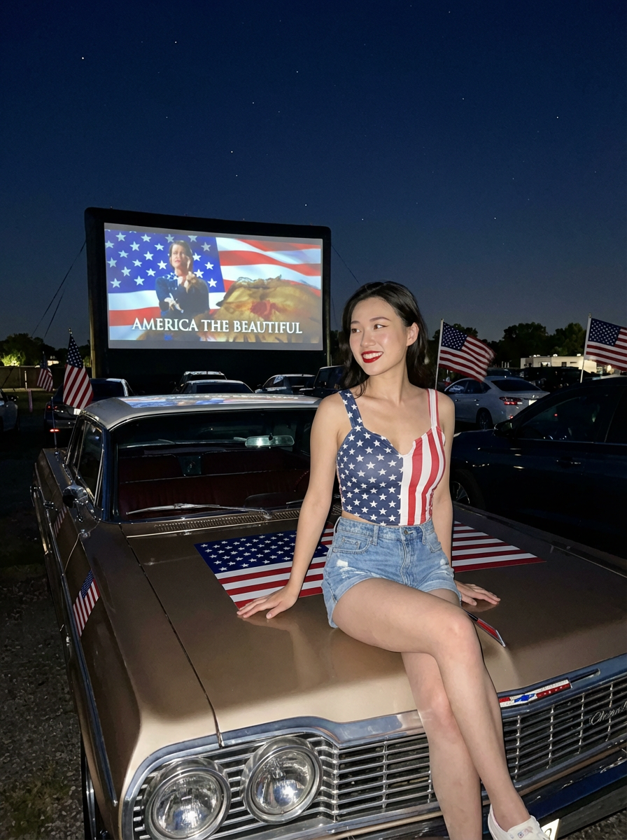 model at a drive-in movie theater showing a patriotic film, sitting on the hood of a classic American-made car decorated with flag decals, wearing a vintage-inspired stars and stripes outfit with red lipstick , under a starry night sky, surrounded by American flags