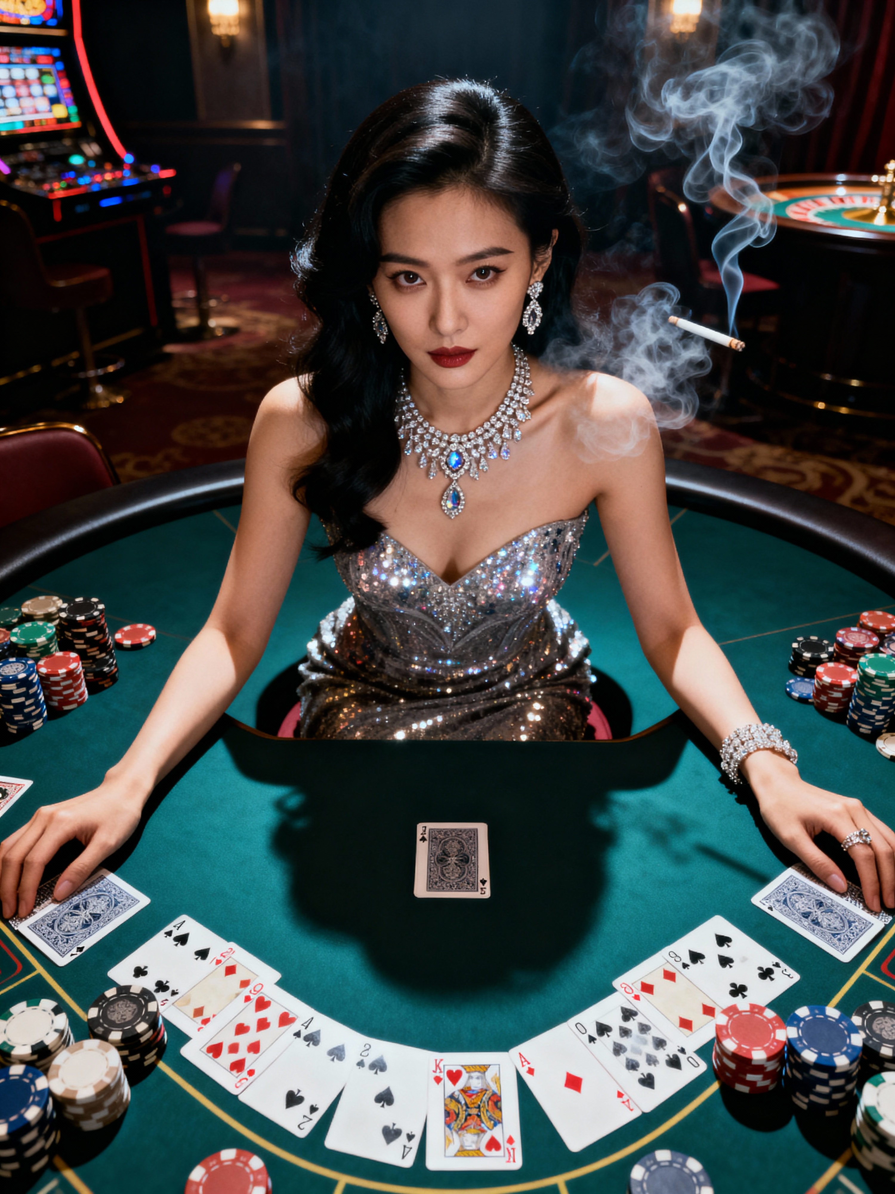 model at a glamorous casino table, wearing a sparkling evening gown with statement jewelry , surrounded by playing cards and chips, dramatic overhead lighting, cigarette smoke swirling, classic film noir composition