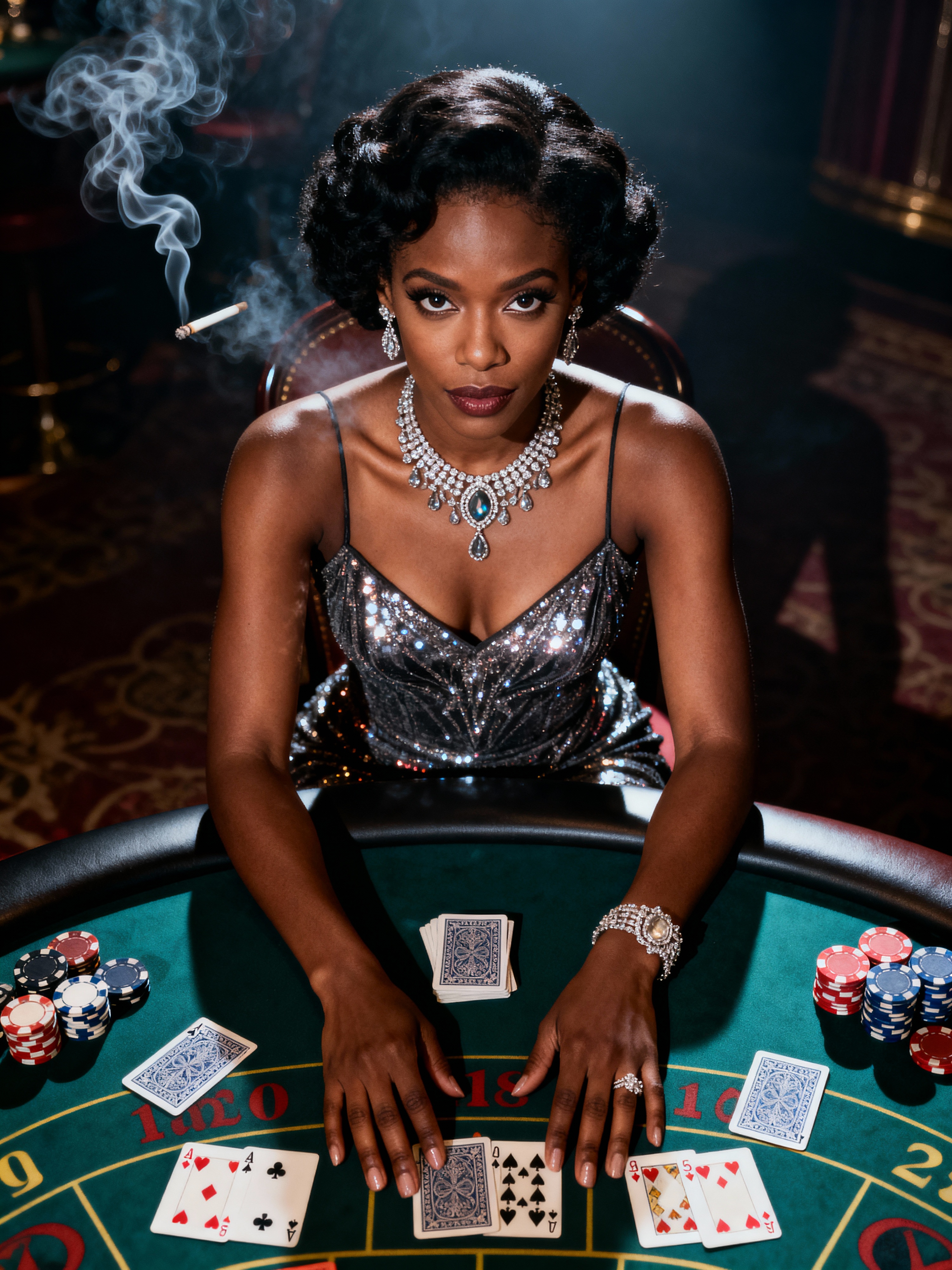 model at a glamorous casino table, wearing a sparkling evening gown with statement jewelry , surrounded by playing cards and chips, dramatic overhead lighting, cigarette smoke swirling, classic film noir composition