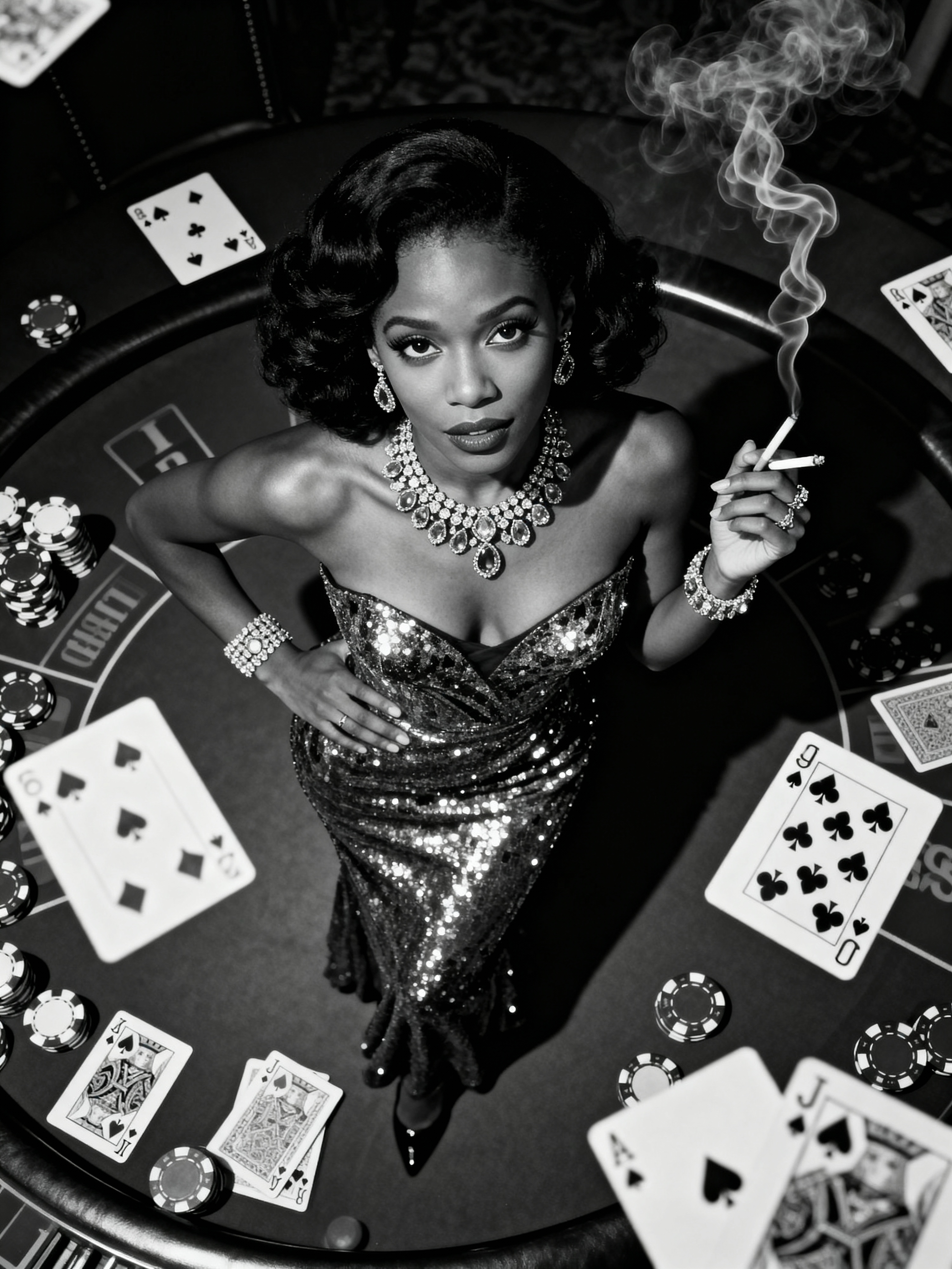 model at a glamorous casino table, wearing a sparkling evening gown with statement jewelry , surrounded by playing cards and chips, dramatic overhead lighting, cigarette smoke swirling, classic film noir composition