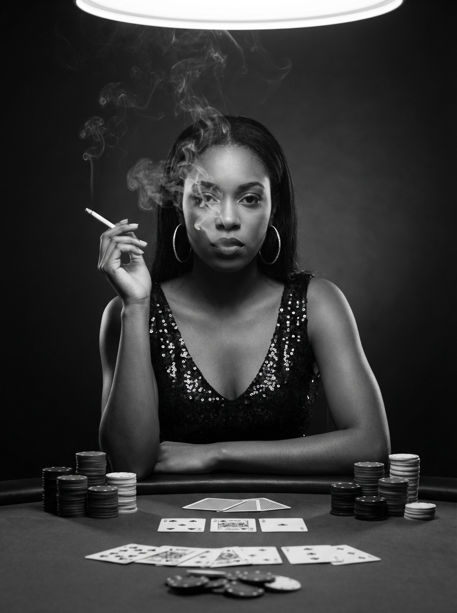 model at a glamorous casino table, wearing a sparkling evening gown with statement jewelry , surrounded by playing cards and chips, dramatic overhead lighting, cigarette smoke swirling, classic film noir composition