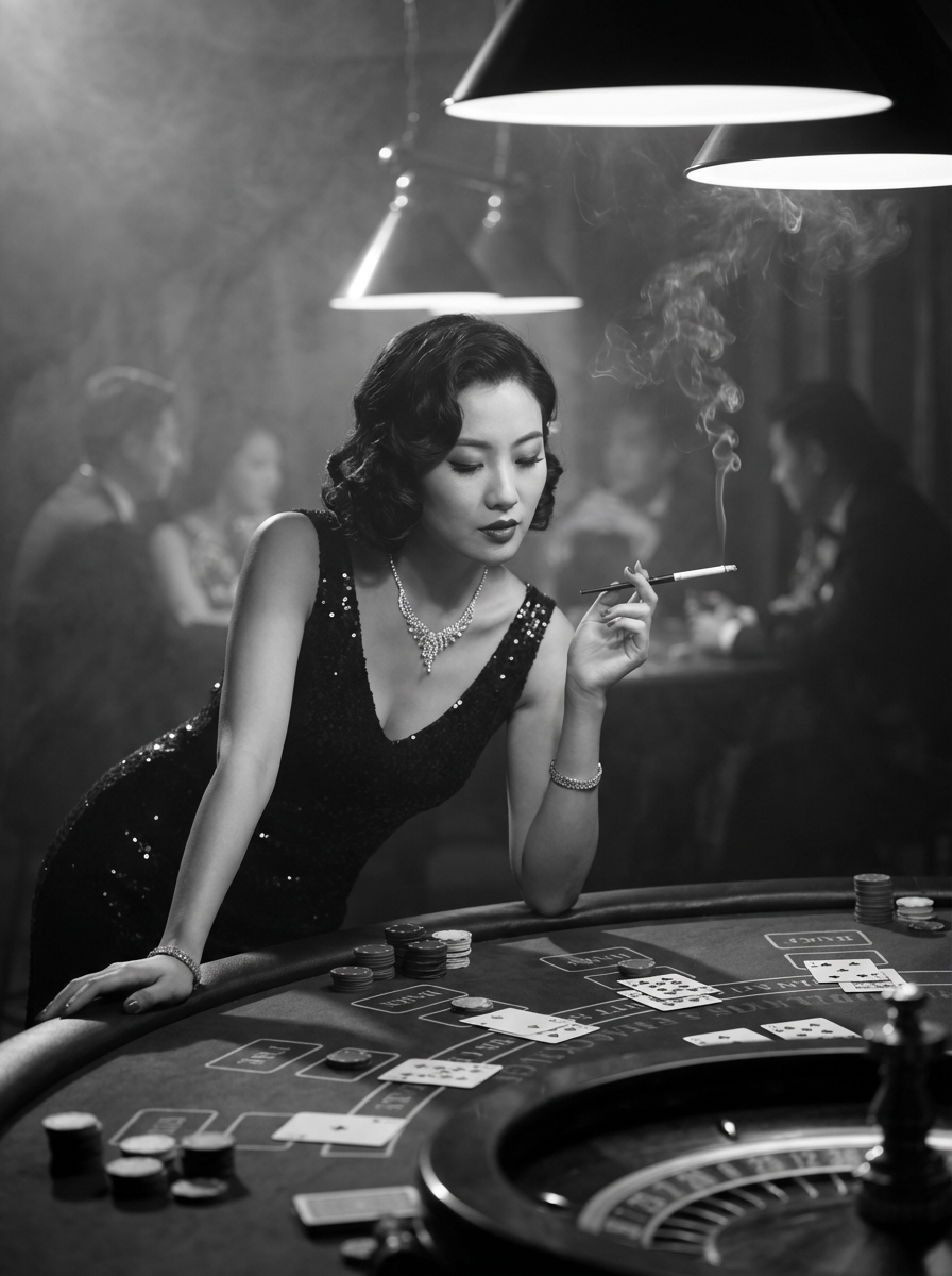 model at a glamorous casino table, wearing a sparkling evening gown with statement jewelry , surrounded by playing cards and chips, dramatic overhead lighting, cigarette smoke swirling, classic film noir composition