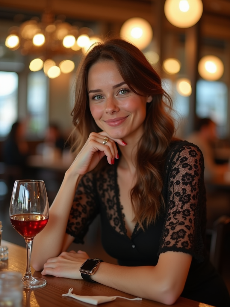 model at a Parisian bistro, wearing smart casual evening wear , enjoying French cuisine