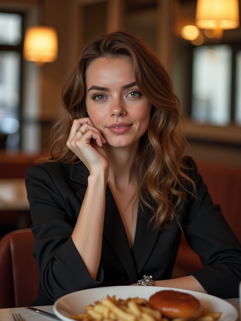 model at a Parisian bistro, wearing smart casual evening wear , enjoying French cuisine
