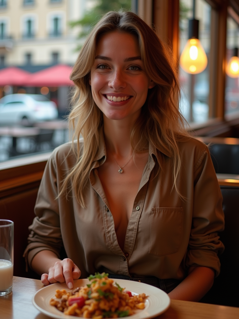 model at a Parisian bistro, wearing smart casual evening wear , enjoying French cuisine