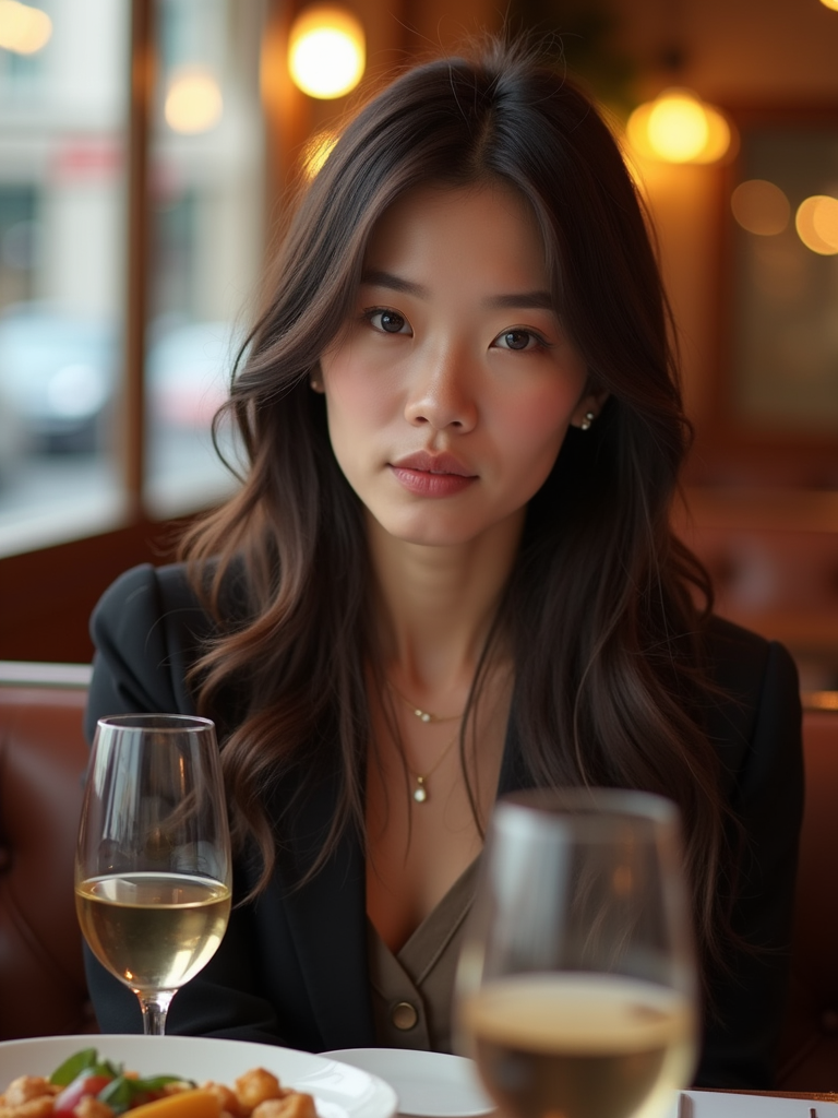 model at a Parisian bistro, wearing smart casual evening wear , enjoying French cuisine