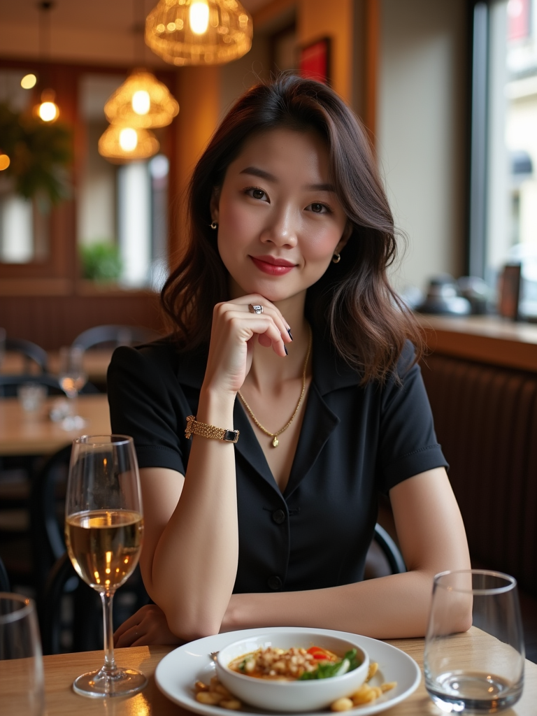 model at a Parisian bistro, wearing smart casual evening wear , enjoying French cuisine