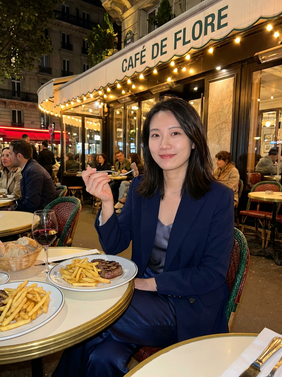 model at a Parisian bistro, wearing smart casual evening wear , enjoying French cuisine
