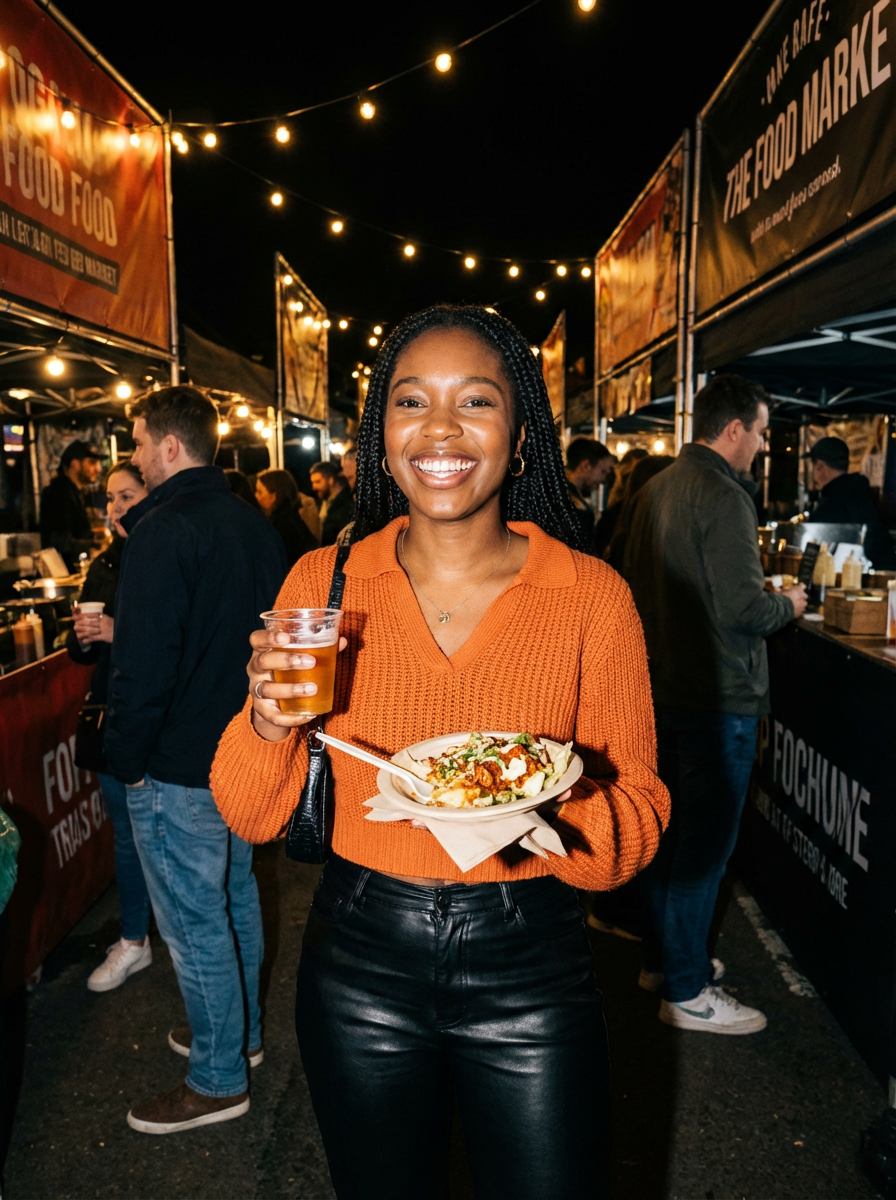 model at a pop-up food market at night, combining the love for street food with nightlife