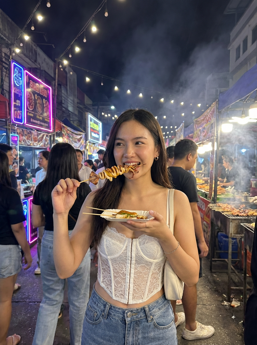 model at a pop-up food market at night, combining the love for street food with nightlife