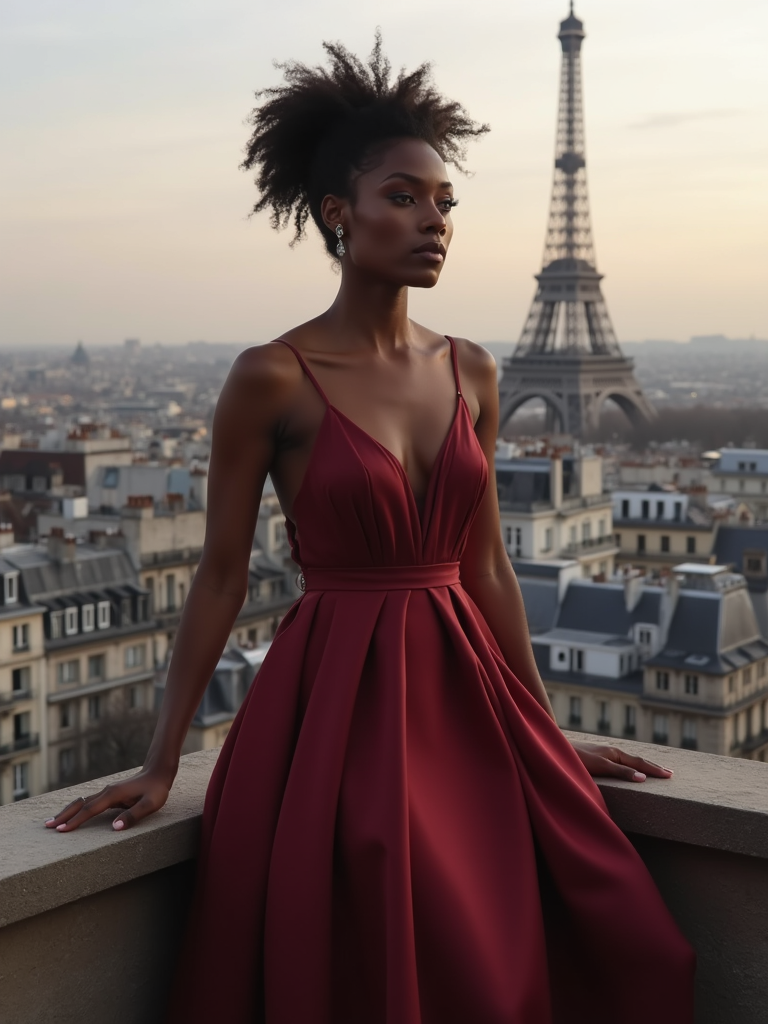 model at a rooftop bar in Montmartre, wearing an elegant cocktail dress , Paris skyline in background