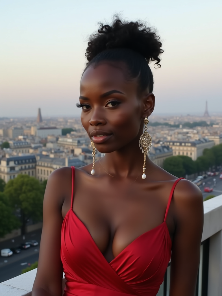 model at a rooftop bar in Montmartre, wearing an elegant cocktail dress , Paris skyline in background