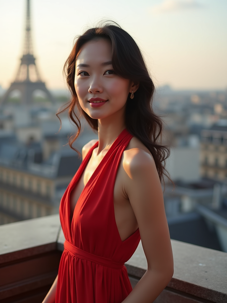 model at a rooftop bar in Montmartre, wearing an elegant cocktail dress , Paris skyline in background