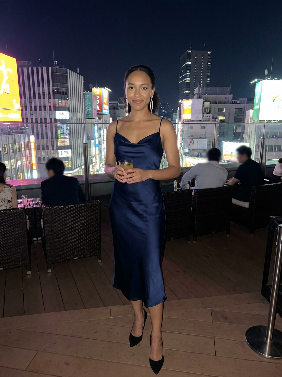 model at a rooftop bar in Shinjuku, wearing an elegant cocktail dress , Tokyo skyline in background