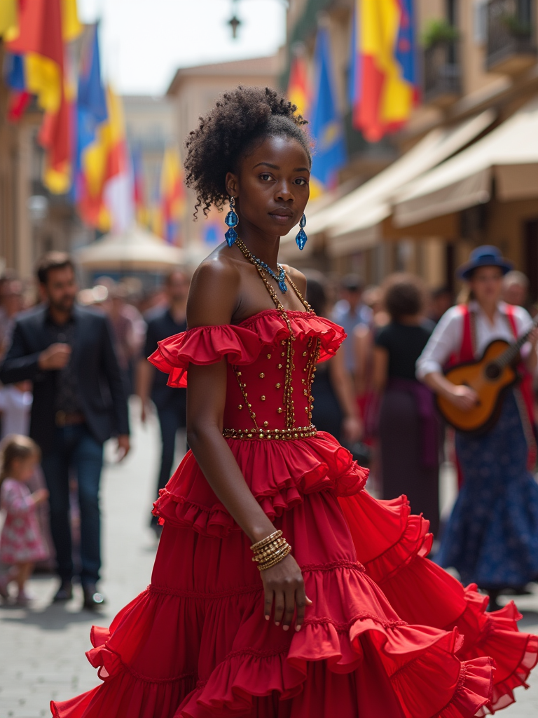 model at a Spanish flamenco festival, wearing a vibrant red dress with blue and gold accessories , surrounded by dancers and musicians, historic plaza decorated with European flags and flowers