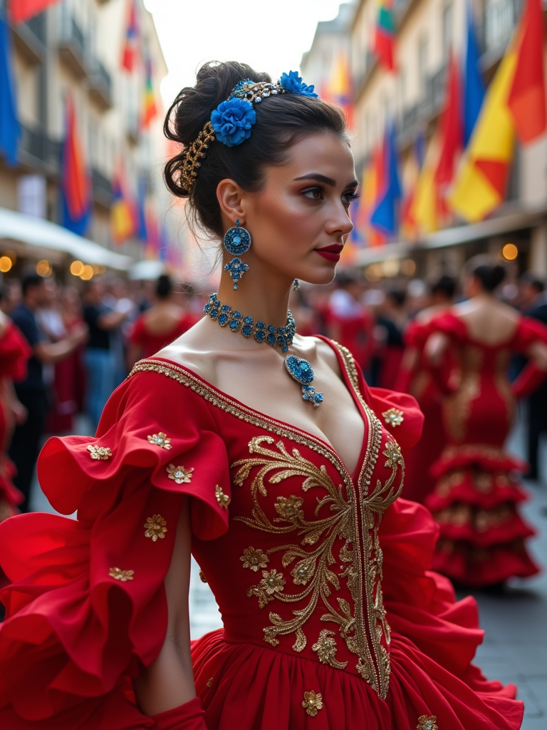 model at a Spanish flamenco festival, wearing a vibrant red dress with blue and gold accessories , surrounded by dancers and musicians, historic plaza decorated with European flags and flowers