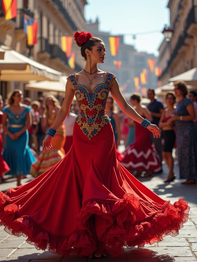 model at a Spanish flamenco festival, wearing a vibrant red dress with blue and gold accessories , surrounded by dancers and musicians, historic plaza decorated with European flags and flowers
