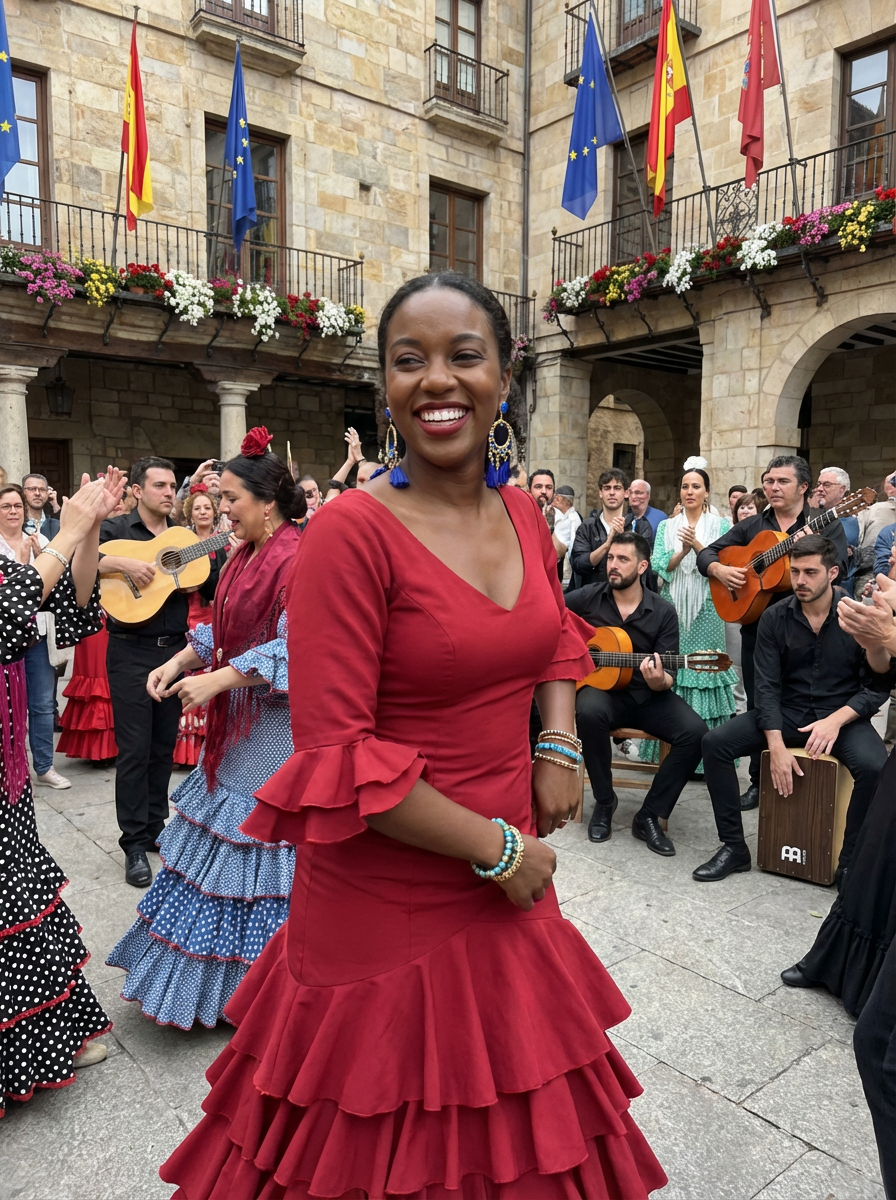 model at a Spanish flamenco festival, wearing a vibrant red dress with blue and gold accessories , surrounded by dancers and musicians, historic plaza decorated with European flags and flowers